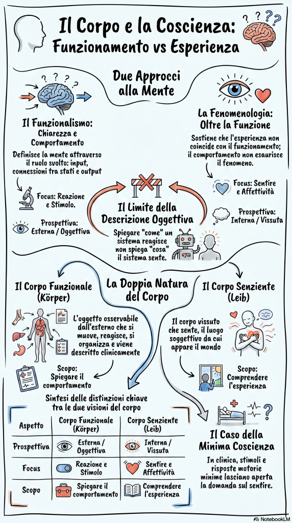 Un dialogo tra due prospettive diverse su una domanda difficile: che cosa possiamo dire della coscienza in una persona non responsiva? Questo audio non offre risposte facili. Prova invece a mettere in tensione due sguardi: uno più funzionalista, attento ai criteri osservabili e ai processi, e uno più fenomenologico, attento a ciò che dell’esperienza soggettiva può eccedere ciò che vediamo dall’esterno. Il punto non è scegliere un vincitore, ma abitare il problema con maggiore rigore