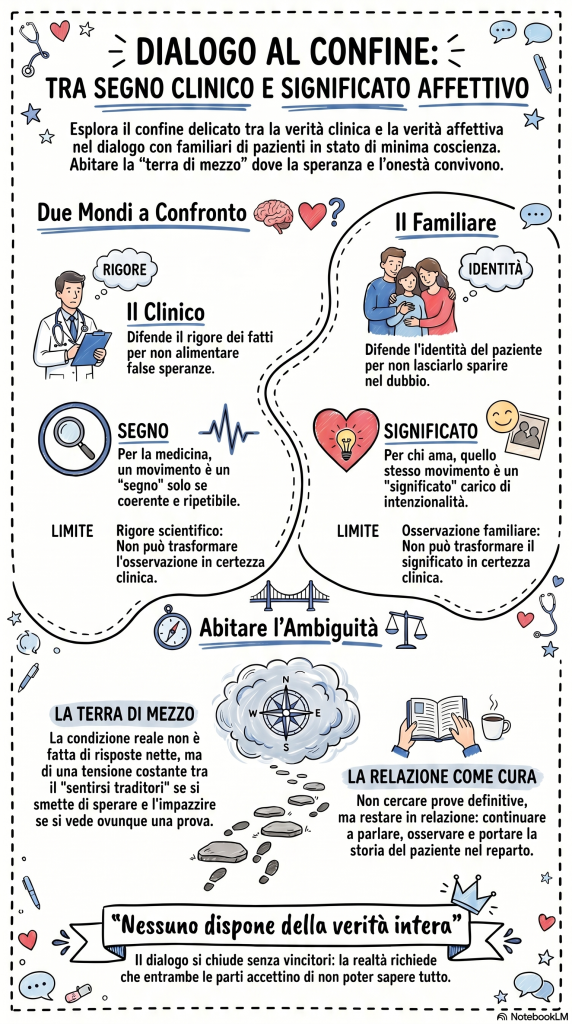 Questo dialogo mette a confronto un clinico e il familiare di un paziente in stato di minima coscienza. Al centro c’è una tensione: da un lato il rigore nel nominare ciò che si può davvero sapere, dall’altro la conoscenza affettiva e biografica di chi resta accanto al paziente. . Attraverso un confronto serrato, emergono le difficoltà nel distinguere tra riflessi neurologici e intenzionalità affettiva, evidenziando il conflitto tra il rigore scientifico e il bisogno di speranza. La fonte sottolinea l’importanza di non risolvere il contrasto, lasciando aperto il dilemma su come abitare onestamente l’incertezza medica.