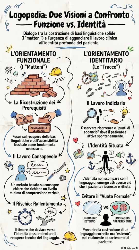 Il dialogo presenta un “dibattito tra due visioni della logopedia” sul trattamento di gravi deficit comunicativi. La prima prospettiva si concentra sulla ricostruzione funzionale del linguaggio, la seconda visione propone un approccio orientato all’identità, che cerca di far emergere la soggettività del paziente attraverso l’osservazione di piccoli segnali e tracce di interesse personale. In sintesi, il dialogo esplora come integrare il rigore clinico con la necessità di rispettare l’unicità della persona, anche in assenza di comprensione verbale esplicita.